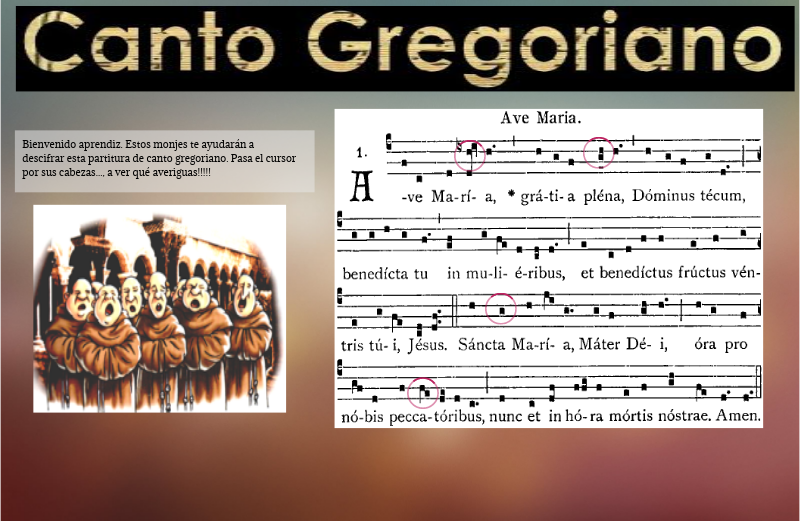 Bienvenido aprendiz. Estos monjes te ayudarán a descifrar esta partitura de canto gregoriano. Pasa el cursor por sus cabezas..., a ver qué averiguas!!!!!