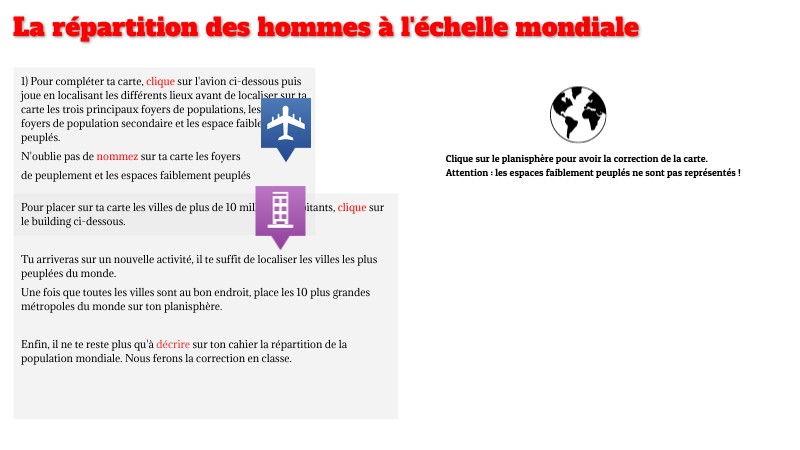 Pour placer sur ta carte les villes de plus de 10 millions d'habitants, clique sur le building ci-dessous. Tu arriveras sur un nouvelle activité, il te suffit de localiser les villes les plus peuplées du monde. Une fois que toutes les villes sont au bon endroit, place les 10 plus grandes métropoles du monde sur ton planisphère. Enfin, il ne te reste plus qu'à décrire sur ton cahier la répartition de la population mondiale. Nous ferons la correction en classe.