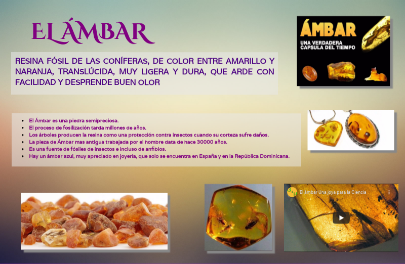RESINA FÓSIL DE LAS CONÍFERAS, DE COLOR ENTRE AMARILLO Y NARANJA, TRANSLÚCIDA, MUY LIGERA Y DURA, QUE ARDE CON FACILIDAD Y DESPRENDE BUEN OLOR
