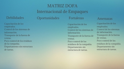 Capacitación de los empleados.Control de los sistemas de información. Transporte de la fuerza de ventas. Poco control de los residuos de la compañia. Departamento sin estructura de tareas.