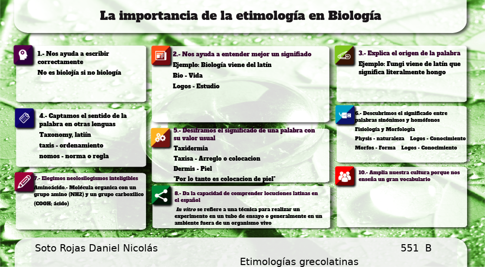2.- Nos ayuda a entender mejor un signifiado Ejemplo: Biología viene del latín Bio - Vida Logos - Estudio
