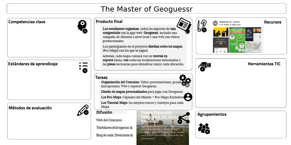 Los estudiantes organizan todos los aspectos de una competición con la app-web Geoguessr, incluida una campaña de difusión a nivel local y una web con vídeos promocionales. Los participantes en el proyecto diseñan todos los mapas (Pro-Maps) con los que se jugará. Además, cada mapa contará con un tutorial en soporte Eduloc con todas las localizaciones informadas y las pistas necesarias para identificar mejor cada ubicación.