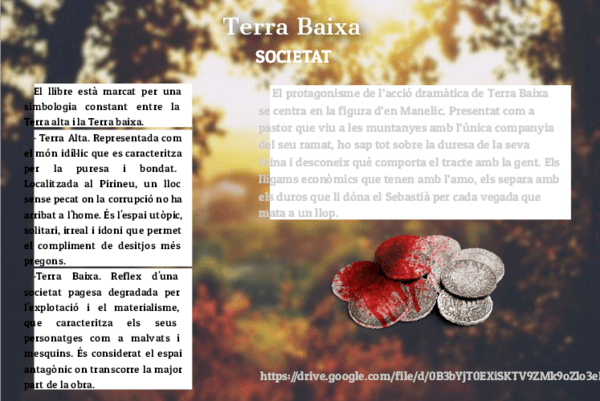- ·Terra Baixa. Reflex d'una societat pagesa degradada per l'explotació i el materialisme, que caracteritza els seus personatges com a malvats i mesquins. És considerat el espai antagònic on transcorre la major part de la obra.