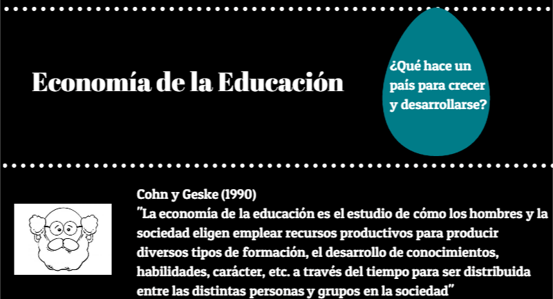 Cohn y Geske (1990)"La economía de la educación es el estudio de cómo los hombres y la sociedad eligen emplear recursos productivos para producir diversos tipos de formación, el desarrollo de conocimientos, habilidades, carácter, etc. a través del tiempo para ser distribuida entre las distintas personas y grupos en la sociedad"