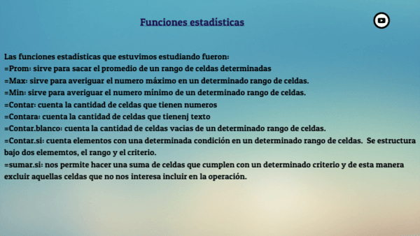 Las funciones estadísticas que estuvimos estudiando fueron:=Prom: sirve para sacar el promedio de un rango de celdas determinadas =Max: sirve para averiguar el numero máximo en un determinado rango de celdas. =Min: sirve para averiguar el numero mínimo de un determinado rango de celdas. =Contar: cuenta la cantidad de celdas que tienen numeros =Contara: cuenta la cantidad de celdas que tienenj texto =Contar.blanco: cuenta la cantidad de celdas vacias de un determinado rango de celdas. =Contar.si: cuenta elementos con una determinada condición en un determinado rango de celdas. Se estructura bajo dos elememtos, el rango y el criterio. =sumar.si: nos permite hacer una suma de celdas que cumplen con un determinado criterio y de esta manera excluir aquellas celdas que no nos interesa incluir en la operación.