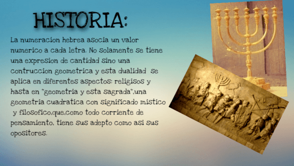 La numeracion hebrea asocia un valor numerico a cada letra. No solamente se tiene una expresion de cantidad sino una contruccion geometrica y esta dualidad se aplica en diferentes aspectos: religisos y hasta en "geometria y esta sagrada",una geometria cuadratica con significado mistico y filosofico,que,como todo corriente de pensamiento, tiene sus adepto como asi sus opositores.