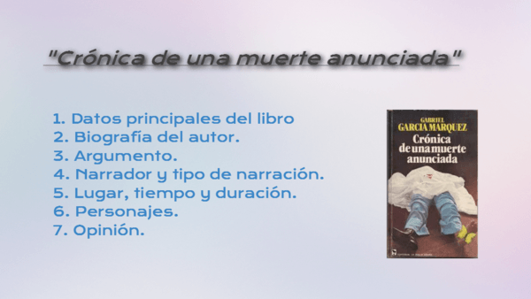 - Título: "Crónica de una muerte anunciada"- Autor: Gabriel García Márquez. - Editorial: Biblioteca "EL MUNDO" -Número de páginas: 95. - Tema: el tema principal de la novela es la venganza.