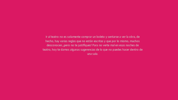 Ir al teatro no es solamente comprar un boleto y sentarse a ver la obra, de hecho, hay varias reglas que no están escritas y que por lo mismo, muchos desconocen, ¡pero no te justifiques! Para no verte mal en esas noches de teatro, hoy te damos algunas sugerencias de lo que no puedes hacer dentro de una sala.