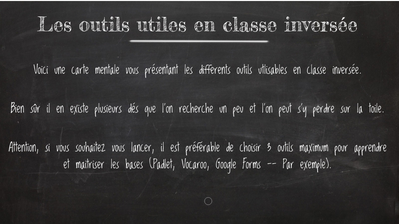Voici une carte mentale vous présentant les differents outils utlisables en classe inversée. Bien sûr il en existe plusieurs dés que l'on recherche un peu et l'on peut s'y perdre sur la toile. Attention, si vous souhaitez vous lancer, il est préférable de choisir 3 outils maximum pour apprendre et maitriser les bases (Padlet, Vocaroo, Google Forms -- Par exemple).