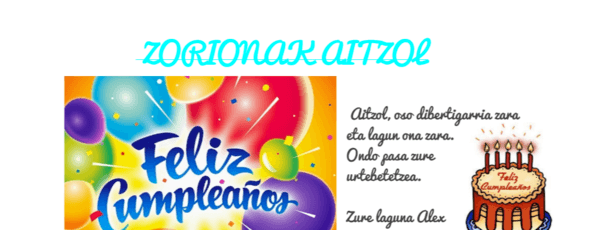 Aitzol, oso dibertigarria zara eta lagun ona zara. Ondo pasa zure urtebetetzea. Zure laguna Alex Feliz cumpleaños AITZOL !eres un gran amigo y espero que seamos buenos amigos.