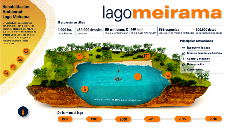 Gráfico interactivo que representa la rehabilitación ambiental de la antigua mina de lignito de Meirama, convertida ahora en un lago.