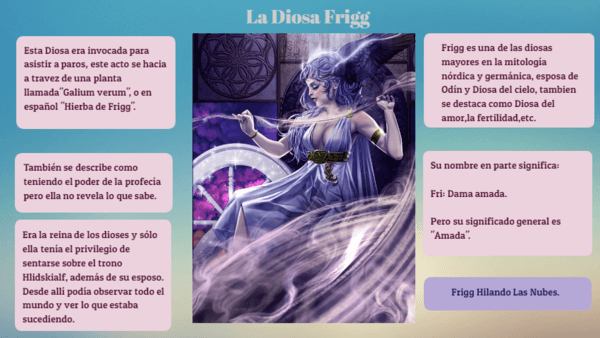 Frigg es una de las diosas mayores en la mitología nórdica y germánica, esposa de Odín y Diosa del cielo, tambien se destaca como Diosa del amor,la fertilidad,etc.