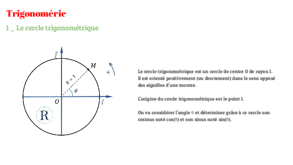 Le cercle trigonométrique est un cercle de centre O de rayon 1.Il est orienté positivement (ou drectement) dans le sens opposé des aiguilles d'une montre. L'origine du cercle trigonométrique est le point I. On va considérer l'angle θ et déterminer grâce à ce cercle son cosinus noté cos(θ) et son sinus noté sin(θ).