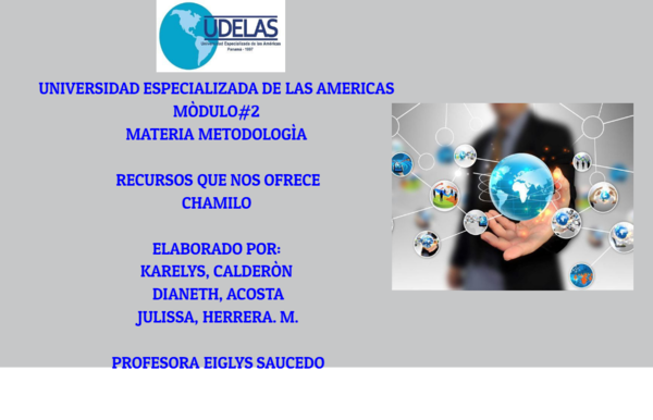 UNIVERSIDAD ESPECIALIZADA DE LAS AMERICAS MÒDULO#2 MATERIA METODOLOGÌA RECURSOS QUE NOS OFRECE CHAMILO ELABORADO POR: KARELYS, CALDERÒN DIANETH, ACOSTA JULISSA, HERRERA. M. PROFESORA EIGLYS SAUCEDO