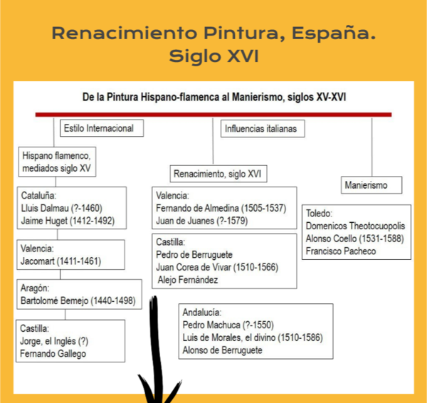 Centros importantes: Castilla y Aragón, siglo XVIPrimer tercio del siglo: elementos italianizantes+ flamencos Segundo tercio: influencia de Rafael. Valencia y Sevilla centros más destacados Tercer tercio: influencia de Miguel Ángel y escuela veneciana