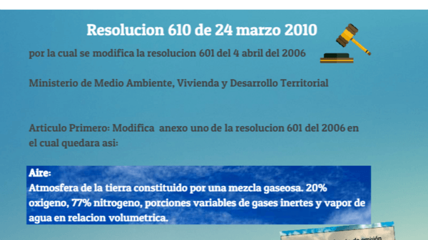 por la cual se modifica la resolucion 601 del 4 abril del 2006 Ministerio de Medio Ambiente, Vivienda y Desarrollo Territorial Articulo Primero: Modifica anexo uno de la resolucion 601 del 2006 en el cual quedara asi: Aire: Atmosfera de la tierra constituido por una mezcla gaseosa. 20% oxigeno, 77% nitrogeno, porciones variables de gases inertes y vapor de agua en relacion volumetrica. Area-Fuente: Zona o region urbana, suburbana o rural que por albergar multiples fuentes fijas de emision es considerada como contaminate del aire. Atmosfera: Capa gaseosa que rodea la tierra contaminates admosfericos Monoxido de Carbono Dioxido de Nitrogeno Ozono Particulas Suspendidas Material particulado < 10micras Material particulado < 2.5micras