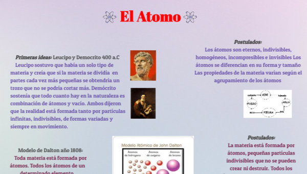 Postulados:La materia está formada por átomos, pequeñas partículas indivisibles que no se pueden crear ni destruir. Todos los átomos de un elemento tienen la misma masa y propiedades. Los átomos de diferentes elementos tienen distinta masa y propiedades. Distintos átomos se combinan entre sí en una relación numérica sencilla y dan lugar a un compuesto, siendo los átomos de un mismo compuesto iguales.