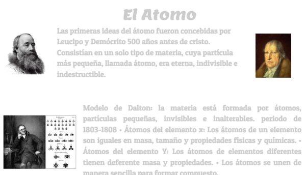 Las primeras ideas del átomo fueron concebidas por Leucipo y Demócrito 500 años antes de cristo. Consistían en un solo tipo de materia, cuya partícula más pequeña, llamada átomo, era eterna, indivisible e indestructible.