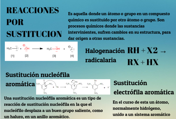 Es aquella donde un átomo o grupo en un compuesto químico es sustituido por otro átomo o grupo. Son procesos químicos donde las sustancias intervinientes, sufren cambios en su estructura, para dar origen a otras sustancias.