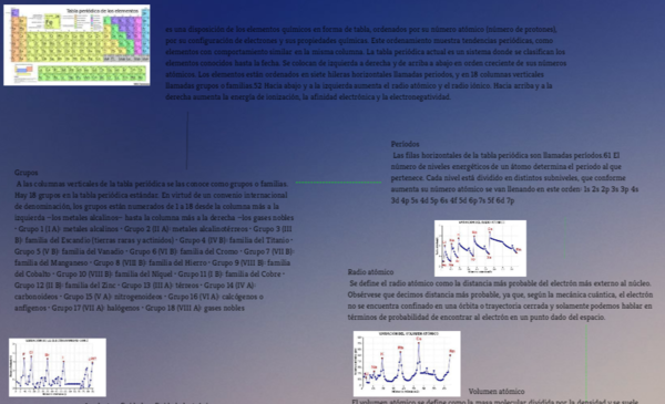 es una disposición de los elementos químicos en forma de tabla, ordenados por su número atómico (número de protones), por su configuración de electrones y sus propiedades químicas. Este ordenamiento muestra tendencias periódicas, como elementos con comportamiento similar en la misma columna. La tabla periódica actual es un sistema donde se clasifican los elementos conocidos hasta la fecha. Se colocan de izquierda a derecha y de arriba a abajo en orden creciente de sus números atómicos. Los elementos están ordenados en siete hileras horizontales llamadas periodos, y en 18 columnas verticales llamadas grupos o familias.52 Hacia abajo y a la izquierda aumenta el radio atómico y el radio iónico. Hacia arriba y a la derecha aumenta la energía de ionización, la afinidad electrónica y la electronegatividad.
