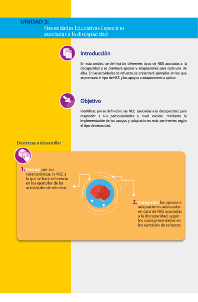 En esta unidad, se definirá los diferentes tipos de NEE asociadas a la discapacidad y se planteará apoyos y adaptaciones para cada una de ellas. En las actividades de refuerzo, se presentará ejemplos en los que se precisará el tipo de NEE y los apoyos o adaptaciones a aplicar.