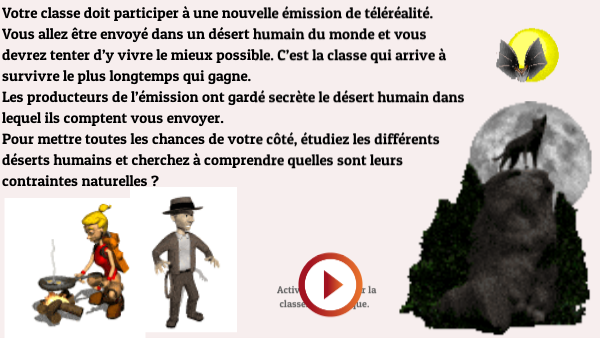 Votre classe doit participer à une nouvelle émission de téléréalité. Vous allez être envoyé dans un désert humain du monde et vous devrez tenter d’y vivre le mieux possible. C’est la classe qui arrive à survivre le plus longtemps qui gagne. Les producteurs de l’émission ont gardé secrète le désert humain dans lequel ils comptent vous envoyer. Pour mettre toutes les chances de votre côté, étudiez les différents déserts humains et cherchez à comprendre quelles sont leurs contraintes naturelles ?