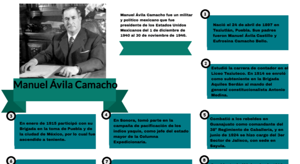 Manuel Ávila Camacho fue un militar y político mexicano que fue presidente de los Estados Unidos Mexicanos del 1 de diciembre de 1940 al 30 de noviembre de 1946.