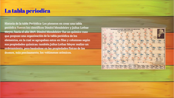Historia de la tabla Periódica: Los pioneros en crear una tabla periódica fueron los científicos Dimitri Mendeleiev y Julius Lothar Meyer, hacia el año 1869. Dimitri Mendeleiev fue un químico ruso que propuso una organización de la tabla periódica de los elementos, en la cual se agrupaban estos en filas y columnas según sus propiedades químicas; también Julius Lothar Meyer realizo un ordenamiento, pero basándose en las propiedades físicas de los átomos, más precisamente, los volúmenes atómicos.