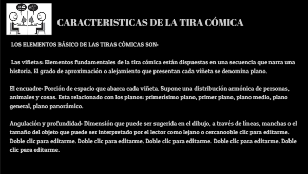 LOS ELEMENTOS BÁSICO DE LAS TIRAS CÓMICAS SON: Las viñetas: Elementos fundamentales de la tira cómica están dispuestas en una secuencia que narra una historia. El grado de aproximación o alejamiento que presentan cada viñeta se denomina plano. El encuadre: Porción de espacio que abarca cada viñeta. Supone una distribución armónica de personas, animales y cosas. Esta relacionado con los planos: primerísimo plano, primer plano, plano medio, plano general, plano panorámico. Angulación y profundidad: Dimensión que puede ser sugerida en el dibujo, a través de líneas, manchas o el tamaño del objeto que puede ser interpretado por el lector como lejano o cercanooble clic para editarme. Doble clic para editarme. Doble clic para editarme. Doble clic para editarme. Doble clic para editarme. Doble clic para editarme.
