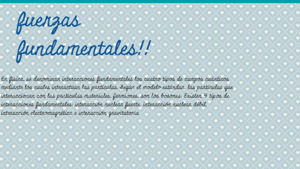 Existen 4 tipos de interacciones fundamentales: interacción nuclear fuerte, interacción nuclear débil, interacción electromagnética e interacción gravitatoria