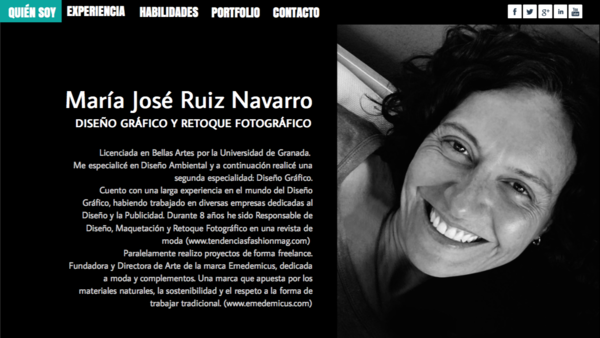 Licenciada en Bellas Artes por la Universidad de Granada. Me especialicé en Diseño Ambiental y a continuación realicé una segunda especialidad: Diseño Gráfico. Cuento con una larga experiencia en el mundo del Diseño Gráfico, habiendo trabajado en diversas empresas dedicadas al Diseño y la Publicidad. Durante 8 años he sido Responsable de Diseño, Maquetación y Retoque Fotográfico en una revista de moda (www.tendenciasfashionmag.com) Paralelamente realizo proyectos de forma freelance. Fundadora y Directora de Arte de la marca Emedemicus, dedicada a moda y complementos. Una marca que apuesta por los materiales naturales, la sostenibilidad y el respeto a la forma de trabajar tradicional. (www.emedemicus.com)