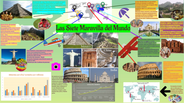 Chichen Itzá :(En maya "Boca del pozo de los brujos de agua") Es un centro ceremonial perteneciente a la cultura maya .Fundación: Año 525 d.c, siglo IV cerca al periodo clasico tardío. Ubicación: Península de Yucatán- Mexico. Inscripción: Declarado como patrimonio de la humanidad en 1988 por la UNESCO y como maravilla del mundo el 7 de julio del 2007. visitantes por año: Alrededor de 1,2 millones de personas.