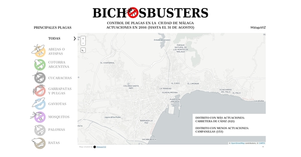 Ubicación de las actuaciones de control de plagas en la ciudad de Málaga en 2016 (hasta el 31 de agosto) por principales especies.