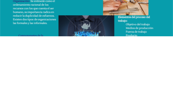 Organización: Se entinede como el ordenamiento racional de los recursos con los que cuenta el ser humano, su importancia radica en reducir la duplicidad de esfuerzos.Existen dos tipos de organicaciones las formales y las informales.