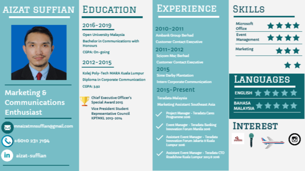 Project Manager - Teradata Cares Programme 2016 Event Manager - Teradata Banking Innovation Forum Manila 2016 Assistant Event Manager - Teradata Innovation Forum Jakarta & Kuala Lumpur 2016 Assistant Event Manager - Teradata CTO Roadshow Kuala Lumpur 2015 & 2016