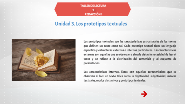 Los prototipos textuales son las características estructurales de los textos que definen un texto como tal. Cada prototipo textual tiene un lenguaje específico y estructuras externas e internas particulares. Las características externas son aquellas que se observan a simple vista sin necesidad de leer el texto y se refiere a la distribución del contenido y al esquema de presentación. Las características internas. Estas son aquellas características que se observan al leer un texto tales como la objetividad, subjetividad, marcas textuales, modos discursivos y prototipos textuales.