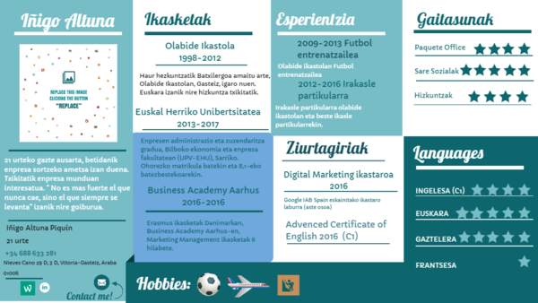 21 urteko gazte ausarta, betidanik enpresa sortzeko ametsa izan duena. Txikitatik enpresa munduan interesatua. " No es mas fuerte el que nunca cae, sino el que siempre se levanta" izanik nire goiburua.
