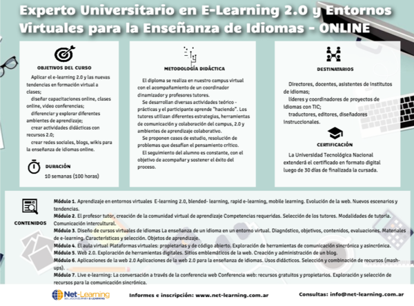 Módulo 1. Aprendizaje en entornos virtuales E-learning 2.0, blended- learning, rapid e-learning, mobile learning. Evolución de la web. Nuevos escenarios y tendencias. Módulo 2. El profesor tutor, creación de la comunidad virtual de aprendizaje Competencias requeridas. Selección de los tutores. Modalidades de tutoría. Comunicación intercultural. Módulo 3. Diseño de cursos virtuales de idiomas La enseñanza de un idioma en un entorno virtual. Diagnóstico, objetivos, contenidos, evaluaciones. Materiales de e-learning. Características y selección. Objetos de aprendizaje. Módulo 4. El aula virtual Plataformas virtuales: propietarias y de código abierto. Exploración de herramientas de comunicación sincrónica y asincrónica. Módulo 5. Web 2.0. Exploración de herramientas digitales. Sitios emblemáticos de la web. Creación y administración de un blog. Módulo 6. Aplicaciones de la web 2.0 Aplicaciones de la web 2.0 para la enseñanza de idiomas. Usos didácticos. Selección y combinación de recursos (mash-ups). Módulo 7. Live e-learning: La conversación a través de la conferencia web Conferencia web: recursos gratuitos y propietarios. Exploración y selección de recursos para la comunicación sincrónica.