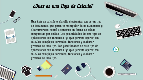 Una hoja de cálculo o planilla electrónica son es un tipo de documento, que permite manipular datos numéricos y alfanuméricos (texto) dispuestos en forma de tablas compuestas por celdas. Las posibilidades de este tipo de aplicaciones son inmensas, ya que permite operar con cálculos complejos, fórmulas, funciones y elaborar gráficos de todo tipo. Las posibilidades de este tipo de aplicaciones son inmensas, ya que permite operar con cálculos complejos, fórmulas, funciones y elaborar gráficos de todo tipo.