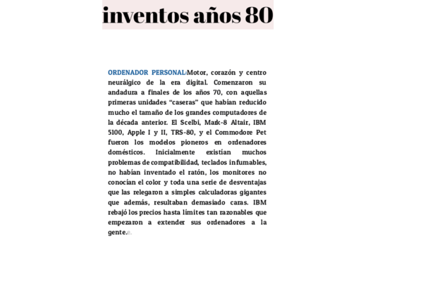 ORDENADOR PERSONAL:Motor, corazón y centro neurálgico de la era digital. Comenzaron su andadura a finales de los años 70, con aquellas primeras unidades “caseras” que habían reducido mucho el tamaño de los grandes computadores de la década anterior. El Scelbi, Mark-8 Altair, IBM 5100, Apple I y II, TRS-80, y el Commodore Pet fueron los modelos pioneros en ordenadores domésticos. Inicialmente existían muchos problemas de compatibilidad, teclados infumables, no habían inventado el ratón, los monitores no conocían el color y toda una serie de desventajas que las relegaron a simples calculadoras gigantes que además, resultaban demasiado caras. IBM rebajó los precios hasta límites tan razonables que empezaron a extender sus ordenadores a la gente.