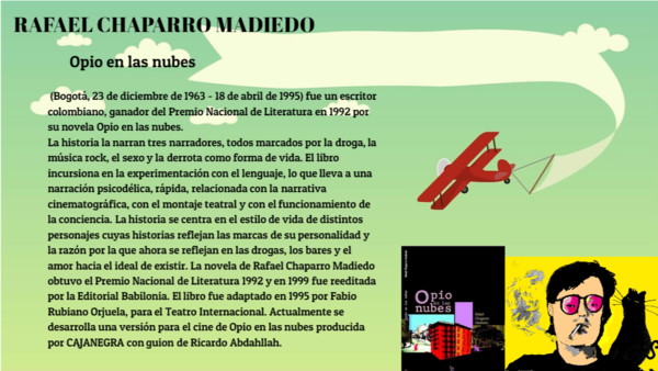 (Bogotá, 23 de diciembre de 1963 - 18 de abril de 1995) fue un escritor colombiano, ganador del Premio Nacional de Literatura en 1992 por su novela Opio en las nubes.La historia la narran tres narradores, todos marcados por la droga, la música rock, el sexo y la derrota como forma de vida. El libro incursiona en la experimentación con el lenguaje, lo que lleva a una narración psicodélica, rápida, relacionada con la narrativa cinematográfica, con el montaje teatral y con el funcionamiento de la conciencia. La historia se centra en el estilo de vida de distintos personajes cuyas historias reflejan las marcas de su personalidad y la razón por la que ahora se reflejan en las drogas, los bares y el amor hacia el ideal de existir. La novela de Rafael Chaparro Madiedo obtuvo el Premio Nacional de Literatura 1992 y en 1999 fue reeditada por la Editorial Babilonia. El libro fue adaptado en 1995 por Fabio Rubiano Orjuela, para el Teatro Internacional. Actualmente se desarrolla una versión para el cine de Opio en las nubes producida por CAJANEGRA con guion de Ricardo Abdahllah.