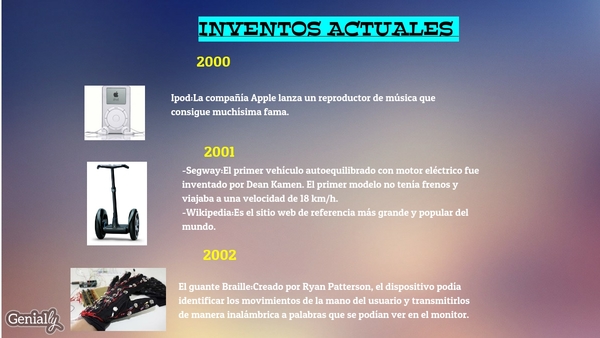 -Segway:El primer vehículo autoequilibrado con motor eléctrico fue inventado por Dean Kamen. El primer modelo no tenía frenos y viajaba a una velocidad de 18 km/h.-Wikipedia:Es el sitio web de referencia más grande y popular del mundo.