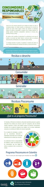 En Colombia, el Ministerio de Ambiente y Desarrollo Sostenible promueve la gestión adecuada de los residuos pos consumo a partir de 7 programas; cada uno atiende residuos específicos y tienen como objetivo separar los desechos correctamente, reciclarlos con la ayuda de empresas que cumplen con las normas ambientales necesarias y la enseñanza de hábitos de consumo responsable.