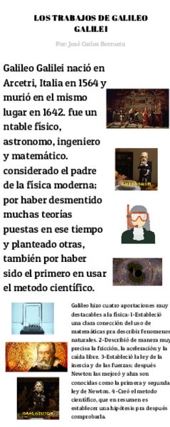 Galileo Galilei nació en Arcetri, Italia en 1564 y murió en el mismo lugar en 1642. fue un ntable físico, astronomo, ingeniero y matemático. considerado el padre de la física moderna; por haber desmentido muchas teorías puestas en ese tiempo y planteado otras, también por haber sido el primero en usar el metodo científico.