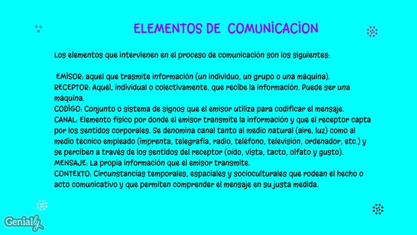 Los elementos que intervienen en el proceso de comunicación son los siguientes: EMISOR: aquel que trasmite información (un individuo, un grupo o una máquina).RECEPTOR: Aquél, individual o colectivamente, que recibe la información. Puede ser una máquina. CODIGO: Conjunto o sistema de signos que el emisor utiliza para codificar el mensaje. CANAL: Elemento físico por donde el emisor transmite la información y que el receptor capta por los sentidos corporales. Se denomina canal tanto al medio natural (aire, luz) como al medio técnico empleado (imprenta, telegrafía, radio, teléfono, televisión, ordenador, etc.) y se perciben a través de los sentidos del receptor (oído, vista, tacto, olfato y gusto). MENSAJE: La propia información que el emisor transmite. CONTEXTO: Circunstancias temporales, espaciales y socioculturales que rodean el hecho o acto comunicativo y que permiten comprender el mensaje en su justa medida.
