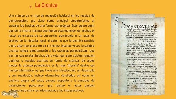 Cronicas Sociales y Culturales:Relatan secuencialmente como se produjo un determinado evento social o cultural.