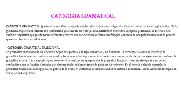 CATEGORIA GRAMATICAL (parte de la oración o categoría morfosintáctica) es una antigua clasificación de las palabras según su tipo. En la gramática española el término fue introducido por Antonio de Nebrija. Modernamente el término categoría gramatical se refiere a una variable lingüística que puede tomar diferentes valores que condicionan la forma morfológica concreta de una palabra mucho más general que el uso tradicional del término-CATEGORIA GRAMATICAL TRADICIONAL En gramática tradicional la clasificación según categorías es de tipo semántico y no funcional. El concepto tal como se introdujo la gramática tradicional se considera superado y ha sido sustituido por un análisis más moderno, no obstante su uso sigue siendo común en la gramática escolar. Las categorías que reconoce y la clasificación que propone la gramática tradicional son morfológicas y no deben confundirse con la función sintáctica que desempeña la palabra o grupo de palabras (locuciones). En el mundo de habla española, la gramática tradicional distingue nueve partes de la oración: Sustantivo (o nombre) Adjetivo Artículo Pronombre Verbo Adverbio Interjección Preposición Conjunción