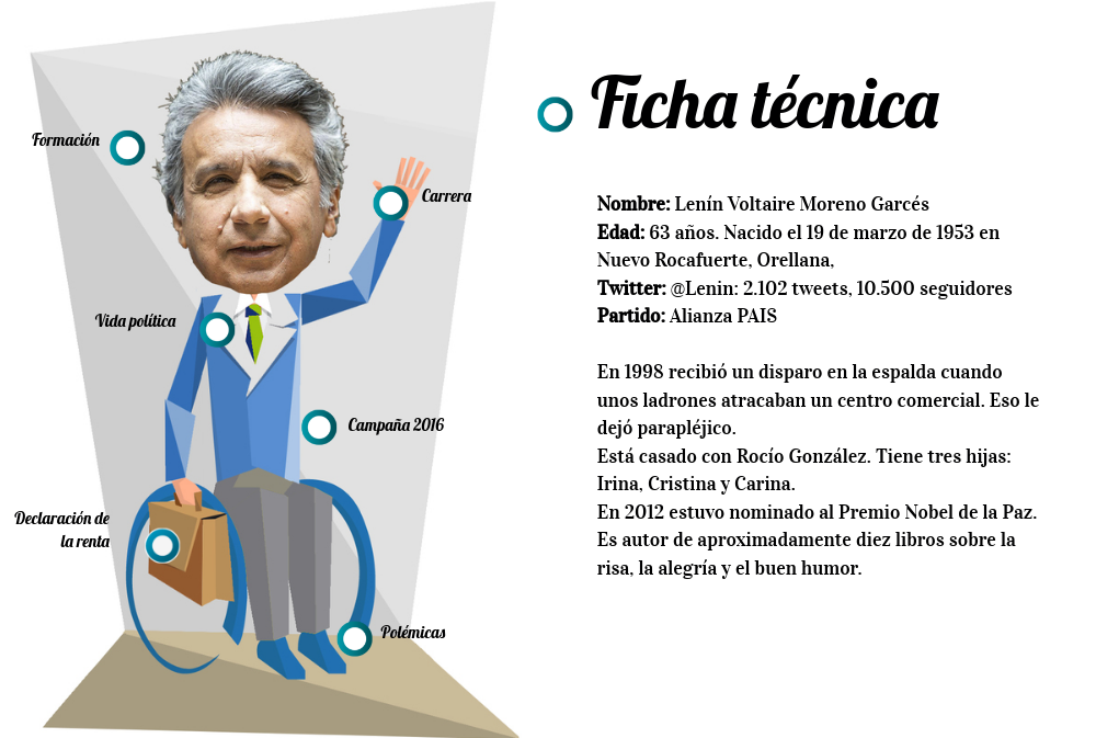 Nombre: Lenín Voltaire Moreno Garcés Edad: 63 años. Nacido el 19 de marzo de 1953 en Nuevo Rocafuerte, Orellana, Twitter: @Lenin: 2.102 tweets, 10.500 seguidores Partido: Alianza PAIS En 1998 recibió un disparo en la espalda cuando unos ladrones atracaban un centro comercial. Eso le dejó parapléjico. Está casado con Rocío González. Tiene tres hijas: Irina, Cristina y Carina. En 2012 estuvo nominado al Premio Nobel de la Paz. Es autor de aproximadamente diez libros sobre la risa, la alegría y el buen humor.