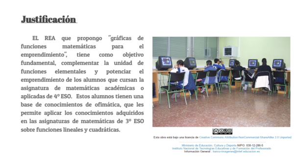 - En mi Centro, también podría aplicar este REA para que los alumnos del módulo que imparto de Ciencias Aplicadas II, del Ciclo formativo de formación profesional básica en Sistemas Administrativos, puedan fomentar su espíritu emprendedor y complementar así la unidad que imparto de "funciones y gráficas", coordinándome con los profesores que imparten el módulo de Aplicaciones Ofimáticas. Sin embargo, por las dificultades que presentan estos alumnos, para la comprensión de los contenidos mínimos que figuran en la programación, y por el comienzo de las prácticas en empresas a finales del mes de abril, veo más factible aplicar este REA, como complemento a los contenidos de funciones elementales de 4 ESO.