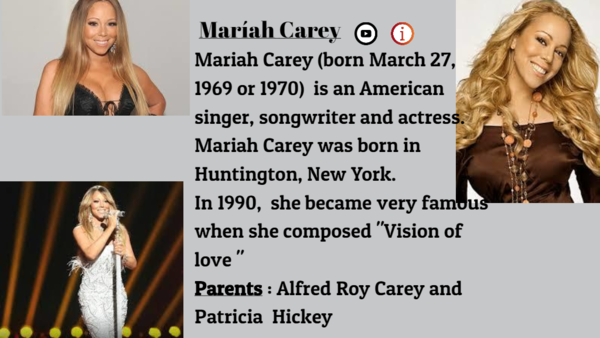 Mariah Carey (born March 27, 1969 or 1970) is an American singer, songwriter and actress. Mariah Carey was born in Huntington, New York.In 1990, she became very famous when she composed "Vision of love "Parents : Alfred Roy Carey and Patricia Hickey